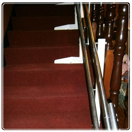 - 從貼滿溫潤木質的地版與牆面 及用地毯覆蓋樓梯的尖銳與稜角 看出王家的溫馨與用心 而在樓梯升降設備的選擇材質上 以不鏽鋼主機、不鏽鋼輪、不鏽鋼實心軌道 提升了乘載重物的踏板力度 及坐人的安全係數