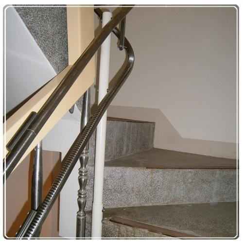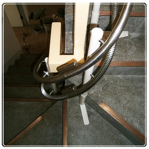 因為突然高起的幾階 我們爬梯機器的軌道在米字梯的位置時就比須拉高處理 這時腳離地面也會比較遠 為了不讓家人乘坐時有驚嚇之感 全包式扶手這時就帶給家人滿滿的安心感